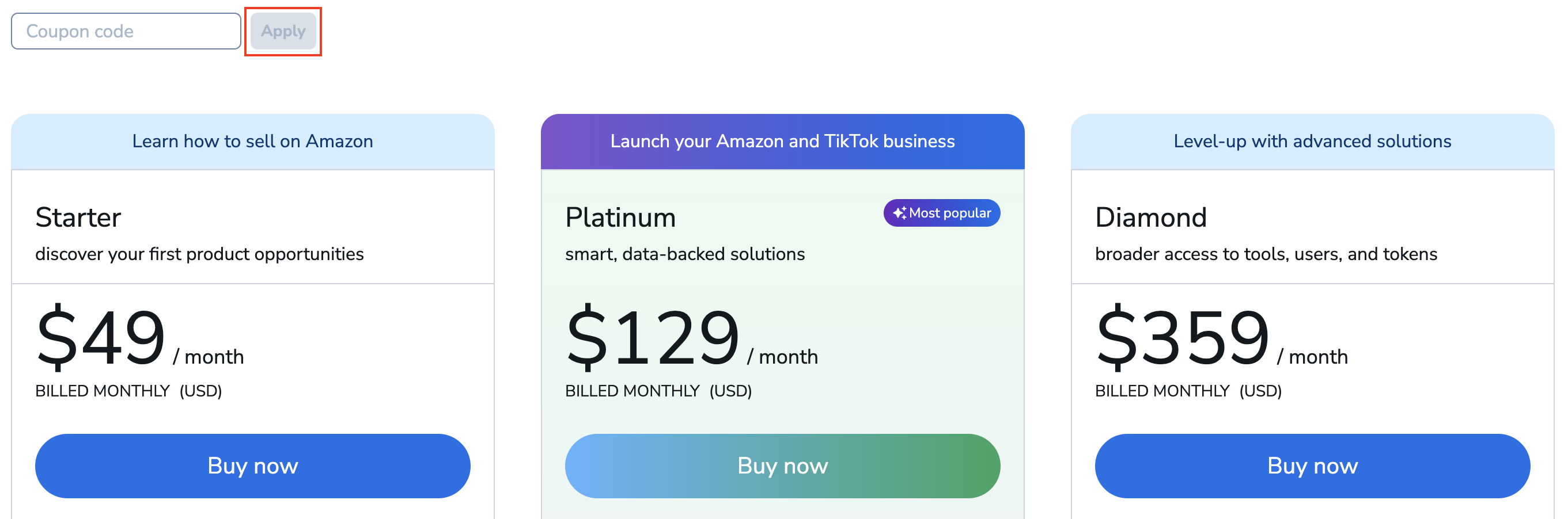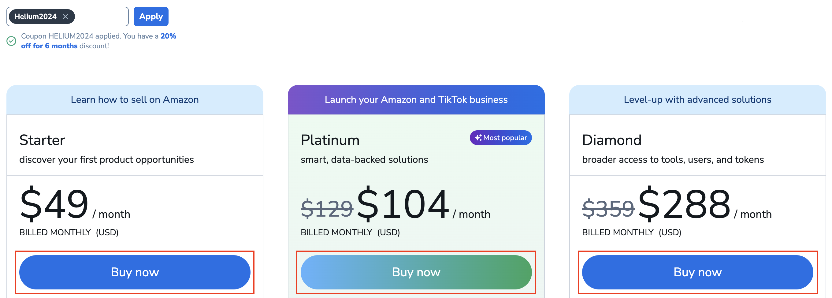 Current Helium 10 Discount Codes Coupon CodeDetailsHELIUM2024Take 20% off your first 6 months Time needed: 2 minutesClaim your discount in just a few steps. Get Started Right Away Get started with Platinum Plan with 20% off your first 6 months.Get Started with the annual Platinum Plan with 10% off.Get started with Diamond Plan with 20% off your first 6 months.Get started with the annual Diamond Plan with 10% off. Or Click Here: https://www.helium10.com/pricing/ Navigate to Coupon Code Field Enter Coupon Code Enter the coupon code: HELIUM2024 to receive 20% OFF your 6 months on qualified plans then click APPLY. Buy Now After you’ve entered in the coupon code and applied it, click Buy Now for Start Your Business or Scale Your Business plan.